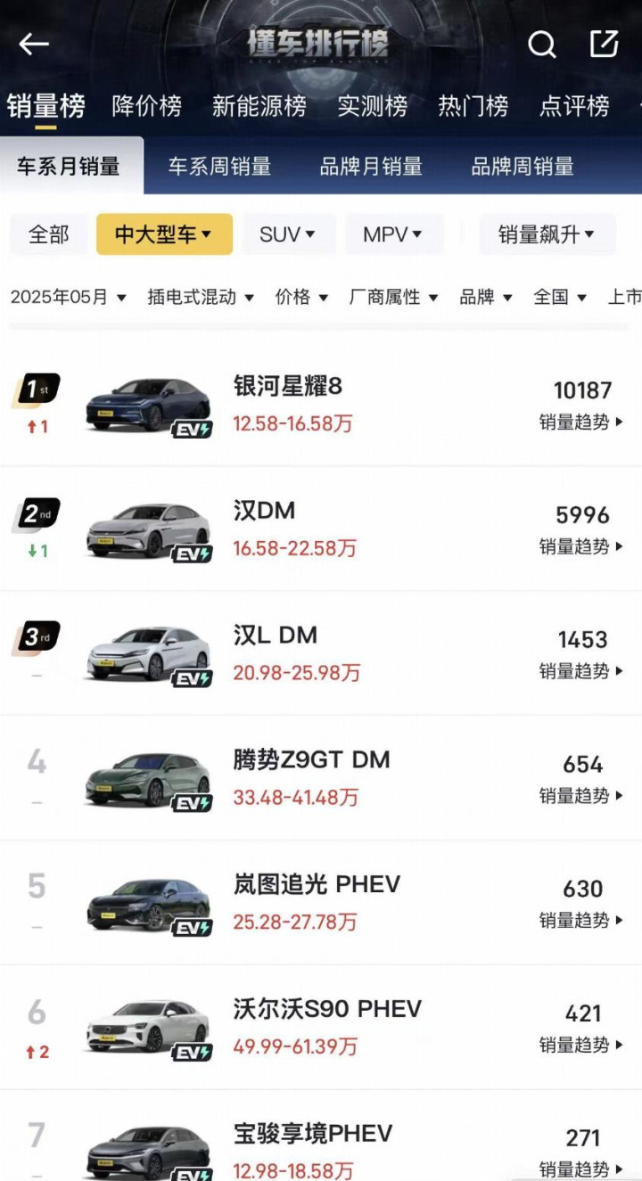 根据销量数据显示,今年5月,在插混中大型车市场,销量最好的车型为吉利银河星耀8,其次是比亚迪汉DM和比亚迪汉L DM,销量分别为10187辆、5996辆和1453辆。您觉得奇瑞风云A9L上市后,销量表现如何?欢迎在文章后留言。